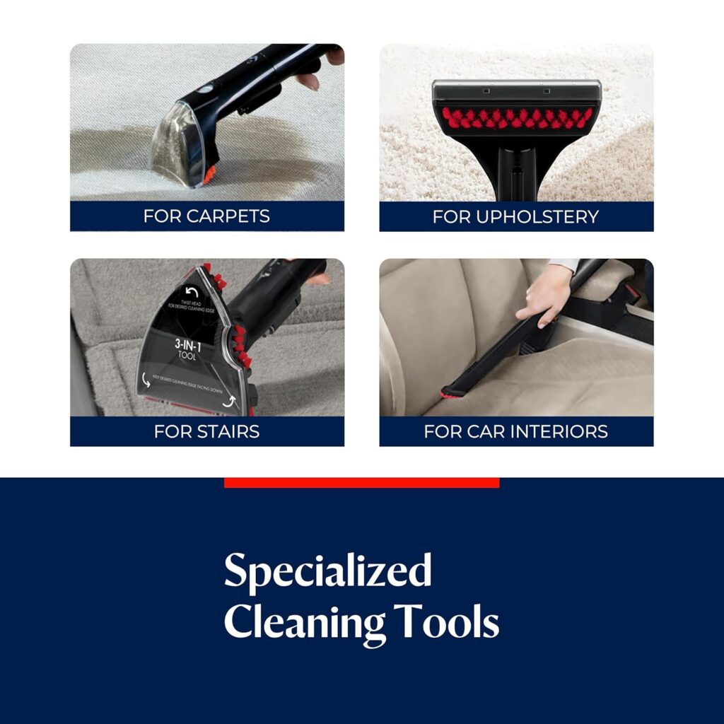 - Specialized Cleaning Tools: Includes the Deep Stain Tool, Tough Stain Tool, and HydroRinse Self-Cleaning Hose.